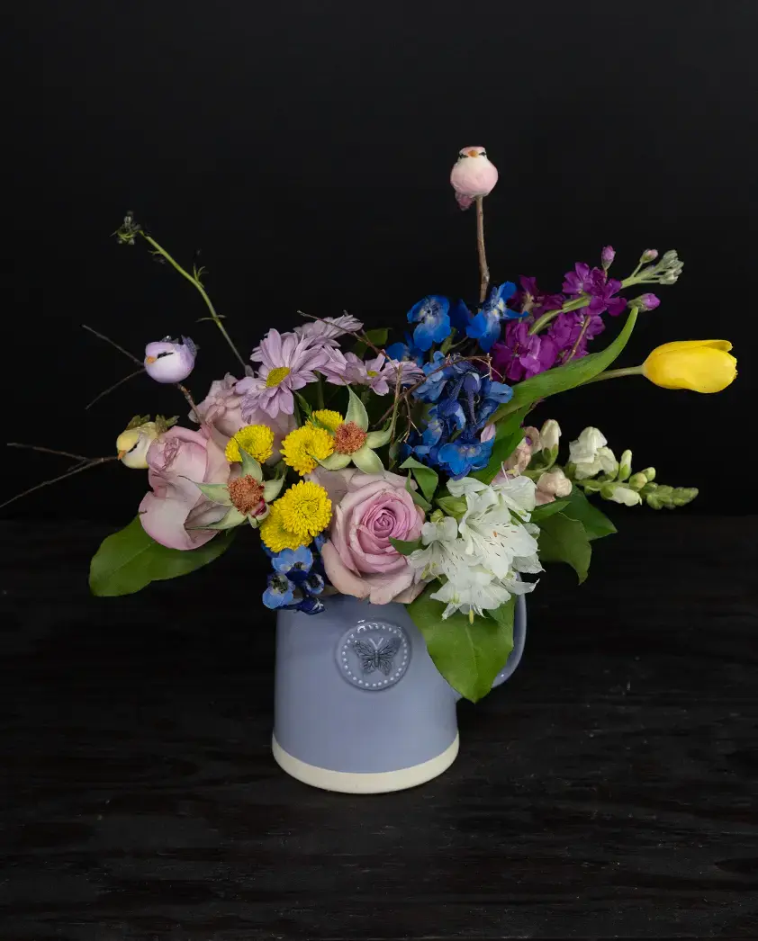 This eye-catching arrangement features a retro hippie tie dye style tumbler filled with a bouquet of colorful mixed flowers, perfect for brightening anyone's day. Meticulously crafted to express joy and peace, this unique gift embodies the playful spirit of the '60s while delivering fresh floral beauty. Experience the charm and exceptional service of bloombudz, where heartfelt gifts come to life with every delivery.